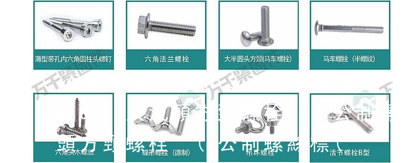 公制螺絲于螺絲型號后方,有時(shí)會注明螺絲牙距,但因?yàn)闃?biāo)準(zhǔn)規(guī)范, 通常不提.公制螺絲, 直接標(biāo)示螺絲長度, 單位為mm. 螺絲之總長度標(biāo)示, 只計(jì)算頭部以下之長度, 不含頭部高度. 但平頭螺絲例外, 其螺絲之總長度標(biāo)示含頭部高度 方頭螺栓c級gb8-88沉頭方頸螺栓gb10-88沉頭帶榫螺拴gb11-88半圓頭方頸螺栓gb12-88半圓頭帶榫螺栓gb13-88大半圓頭方頸螺栓c級gb14-1998大半圓頭帶榫螺栓gb15-88六角頭鉸制孔用螺栓gb27-88六角頭螺桿帶孔鉸制孔