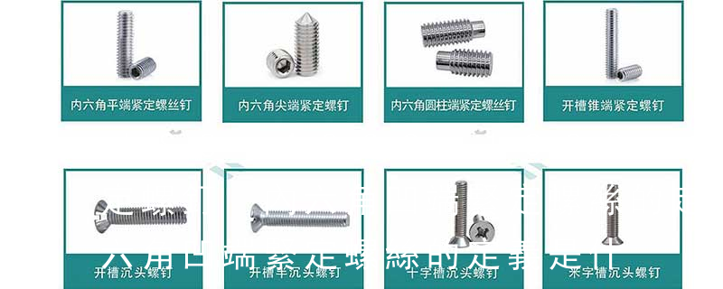 內六角凹端緊定螺釘GB/T 80-2000 方頭長圓柱球面端緊定螺釘GB 83-88 方頭凹端緊釘螺釘GB 84-88 方頭長圓柱端緊定螺釘GB 85-88 方頭短圓柱錐端緊定螺釘 GB 86-88 十字槽盤頭螺釘GB/T 818-2000 六角頭不脫出 不銹鋼螺絲產(chǎn)品主要有:外六角螺栓、圓柱頭內六角螺釘(杯頭)、內六角凹端緊定螺釘(凹端機米)、內六角平端緊定螺釘(平端機米)、內六角尖端緊定螺釘(尖端機米)、內六角柱端緊定螺釘(柱端機米)、沉頭內六角螺釘(平杯)